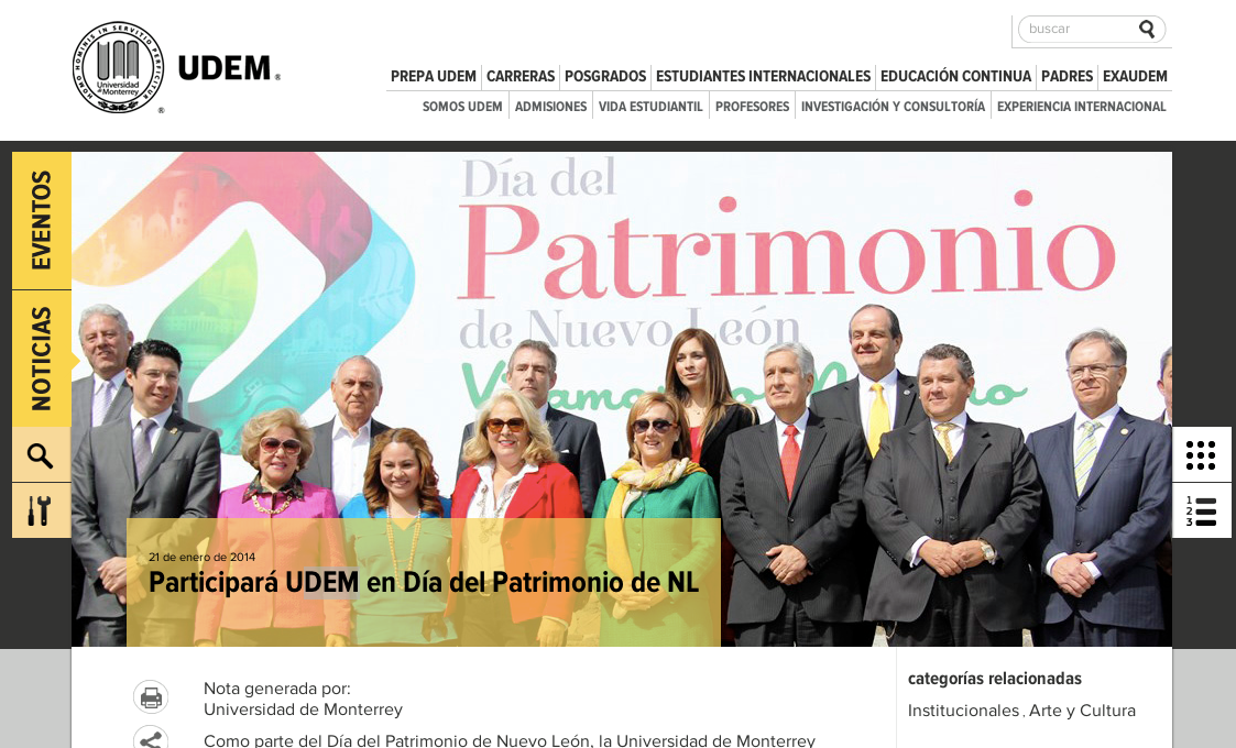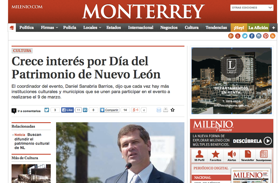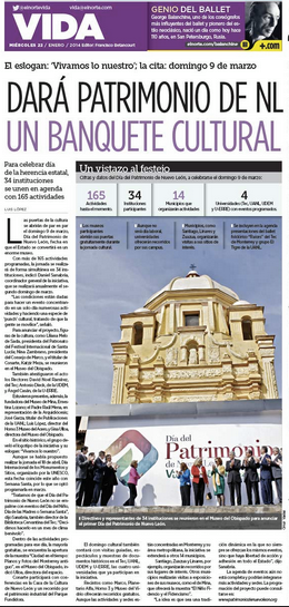 El domingo 9 de marzo de 2014, se llevó a cabo la primera edición del Día del Patrimonio de Nuevo León, donde 44 organizaciones privadas y públicas, administraciones municipales y asociaciones, se comprometieron a realizar más de 170 actividades en por lo menos 50 diferentes espacios, lo que convocó a más de 14,000 ciudadanos participantes en todo el estado de Nuevo León.